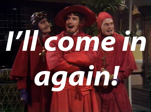 Our three weapons are fear, and surprise, and ruthless efficiency...and an almost fanatical devotion to the Pope.... [The look on his face now shows he realizes he’d left out the fourth point.]